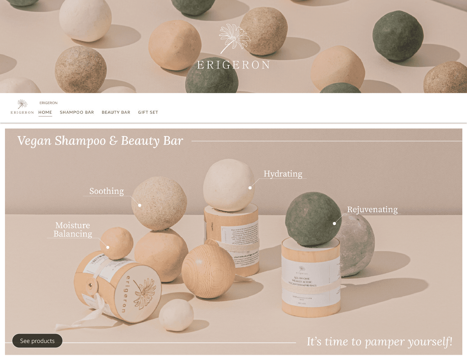 Erigeron was entering the Amazon marketplace with no existing brand presence, needing a store that could communicate their values and differentiate them in a crowded beauty market. | I designed their brand store by developing layouts and visuals that aligned with their existing brand assets and highlighted their core pillars of sustainability, cruelty-free, and clean beauty to connect with conscious shoppers. |
