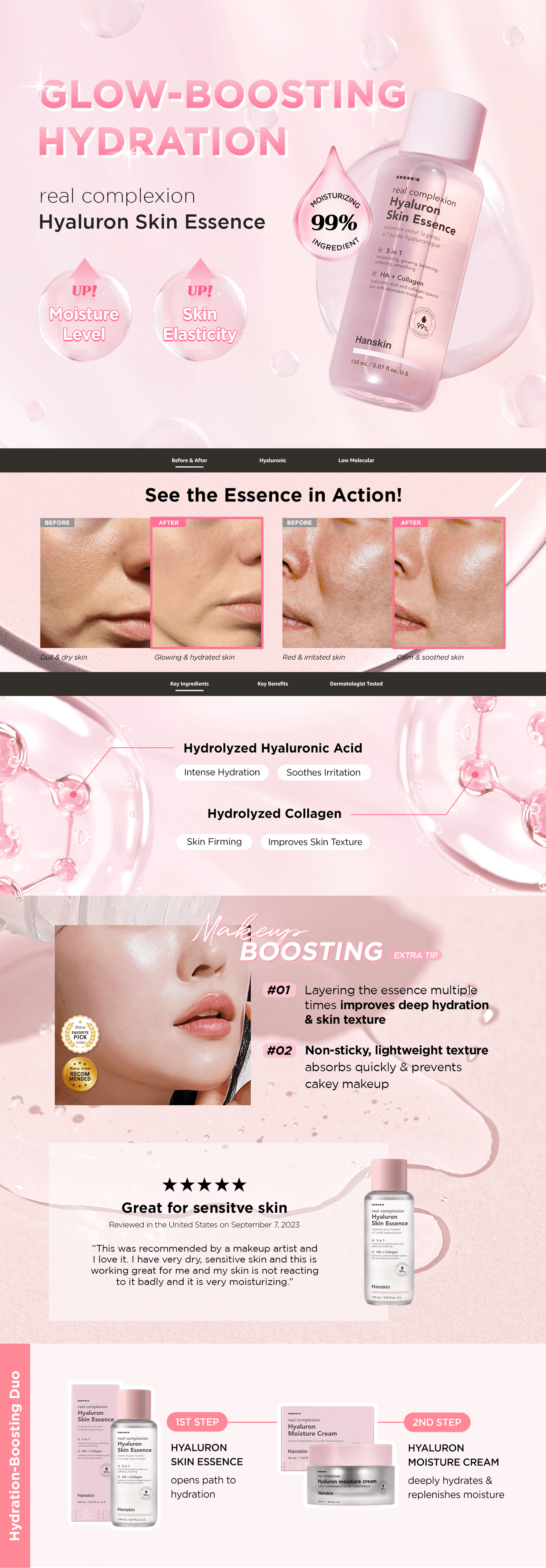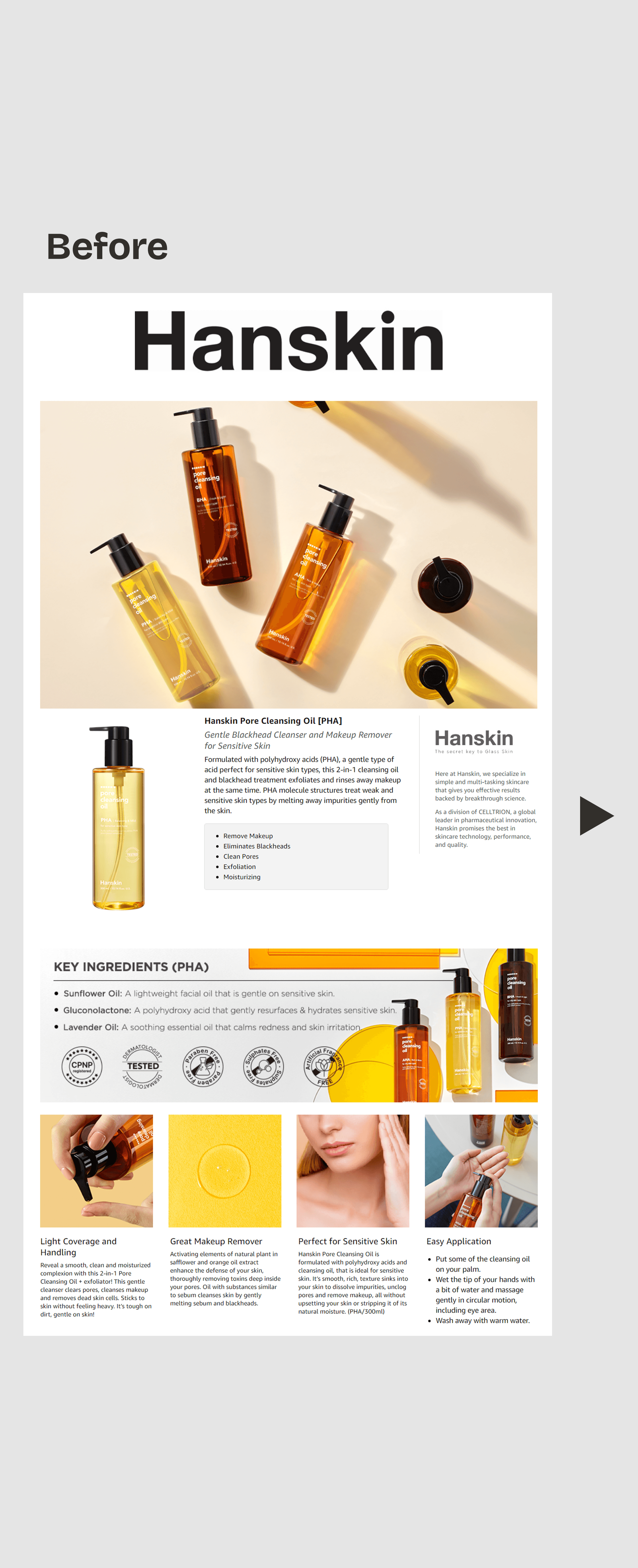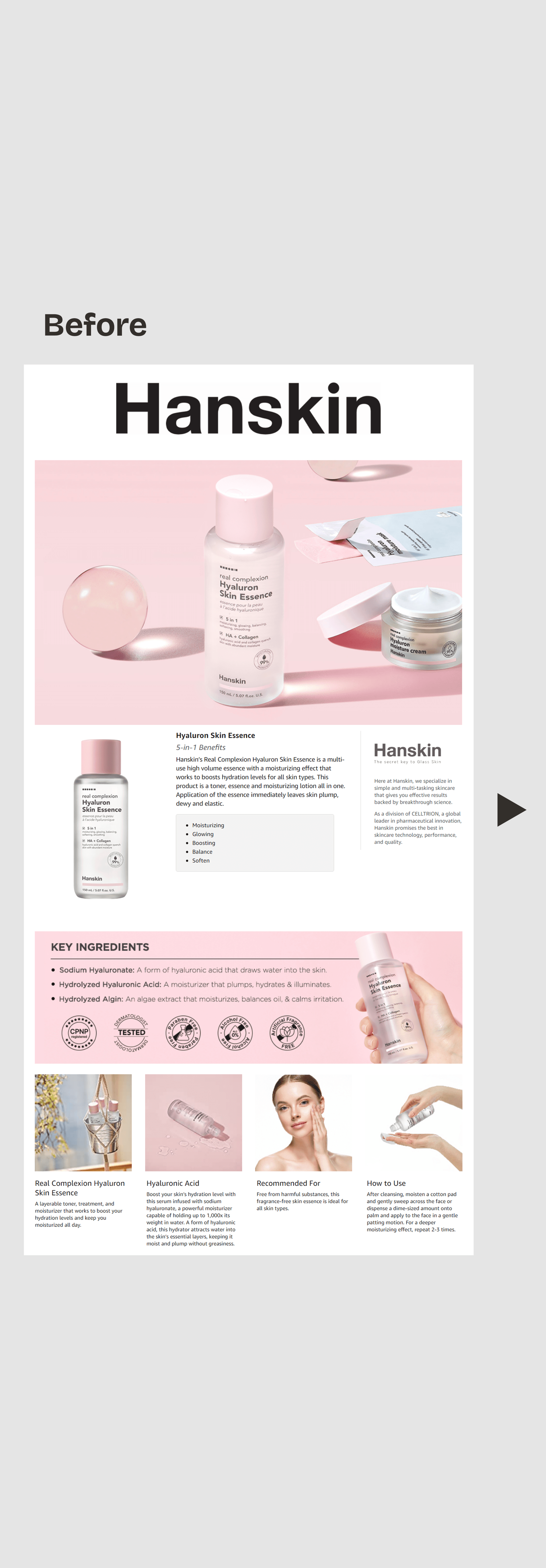 Hanskin's existing listing contents were outdated and failed to effectively communicate the products' key benefits, limiting conversion potential. | Redesigned product listing images and A+ content with a clean, modern aesthetic that prominently showcased dewy skin results and aligned with current marketplace trends. |