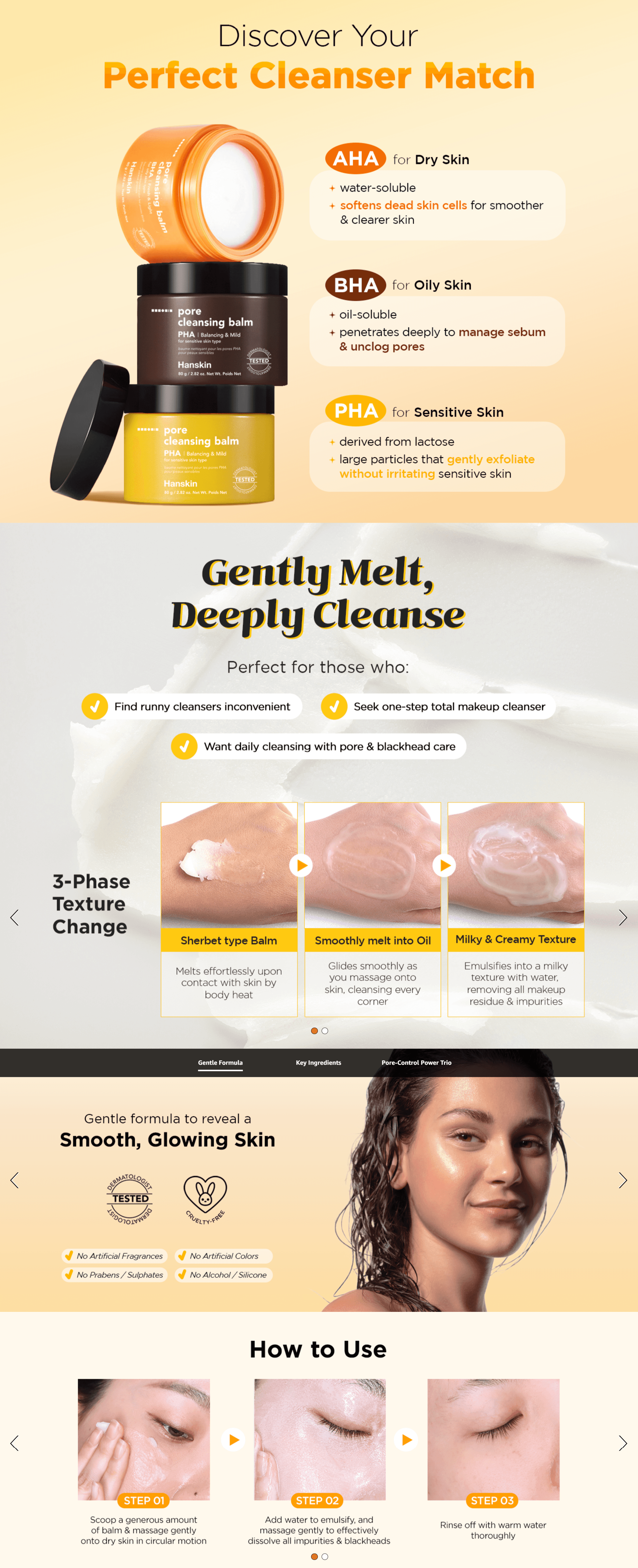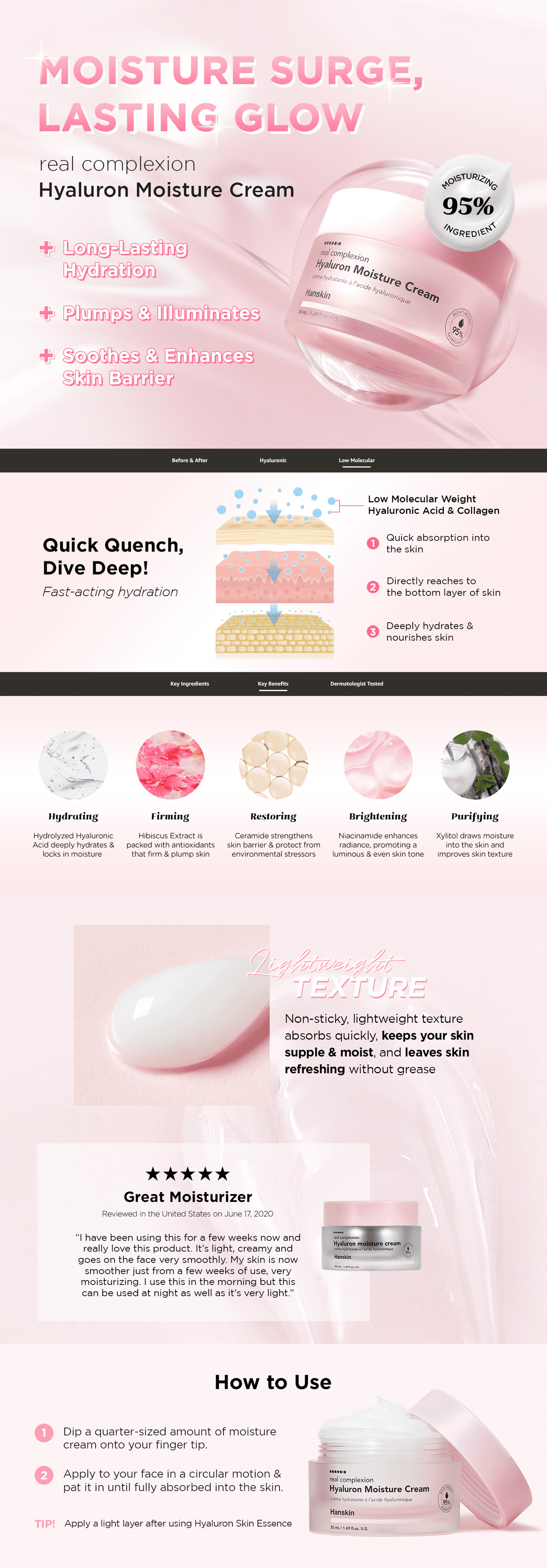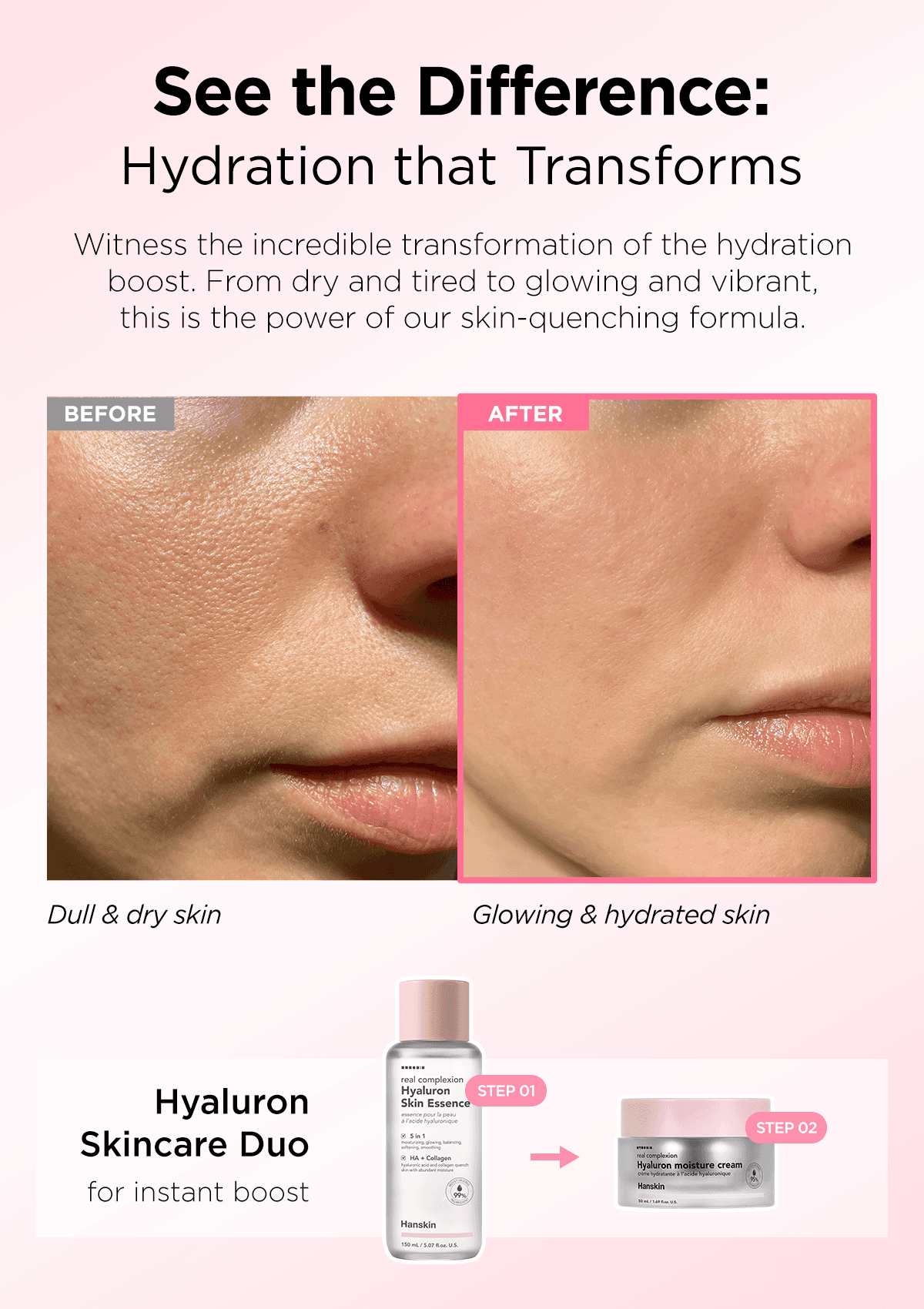 Hanskin's existing listing contents were outdated and failed to effectively communicate the products' key benefits, limiting conversion potential. | Redesigned product listing images and A+ content with a clean, modern aesthetic that prominently showcased dewy skin results and aligned with current marketplace trends. |