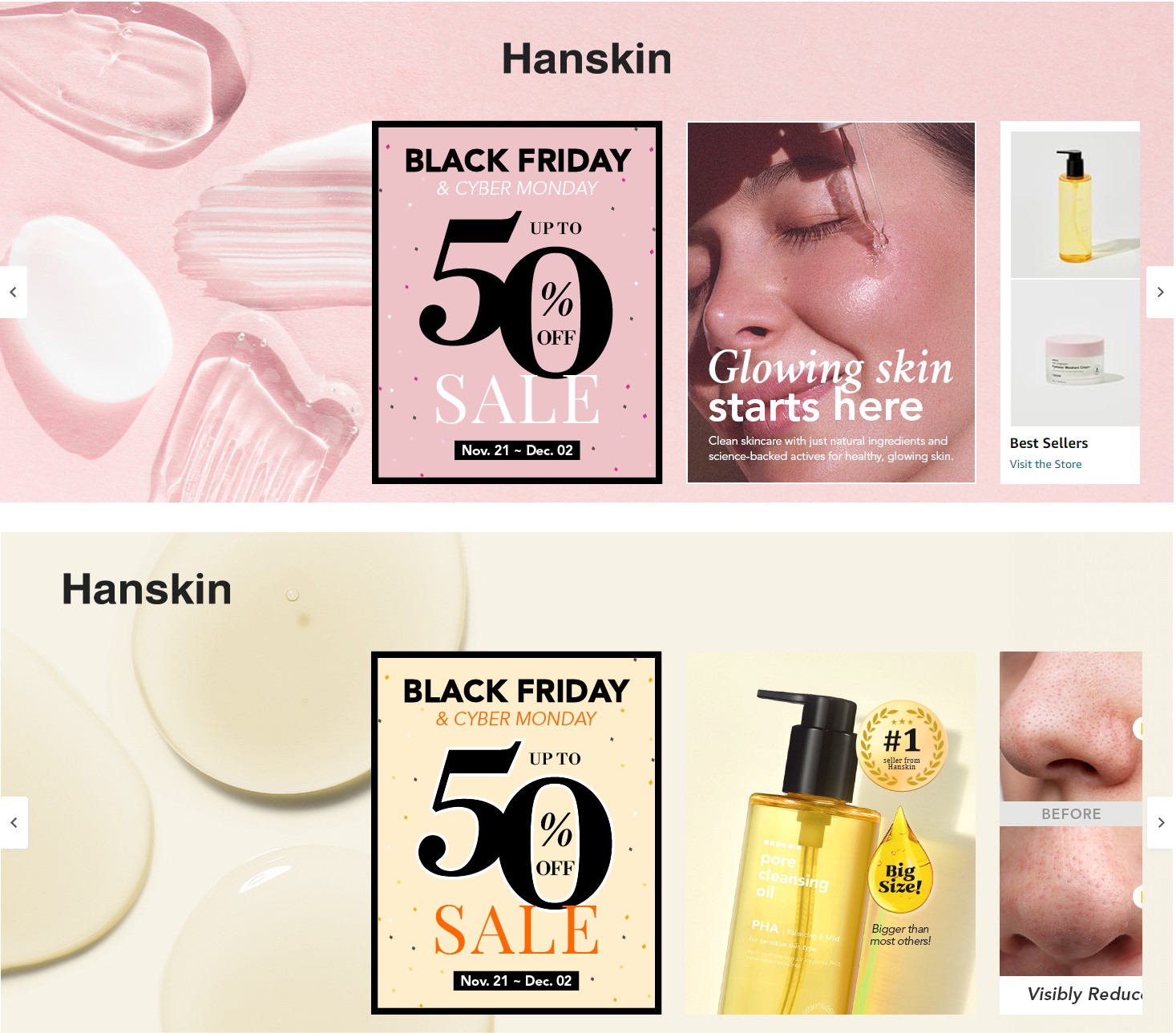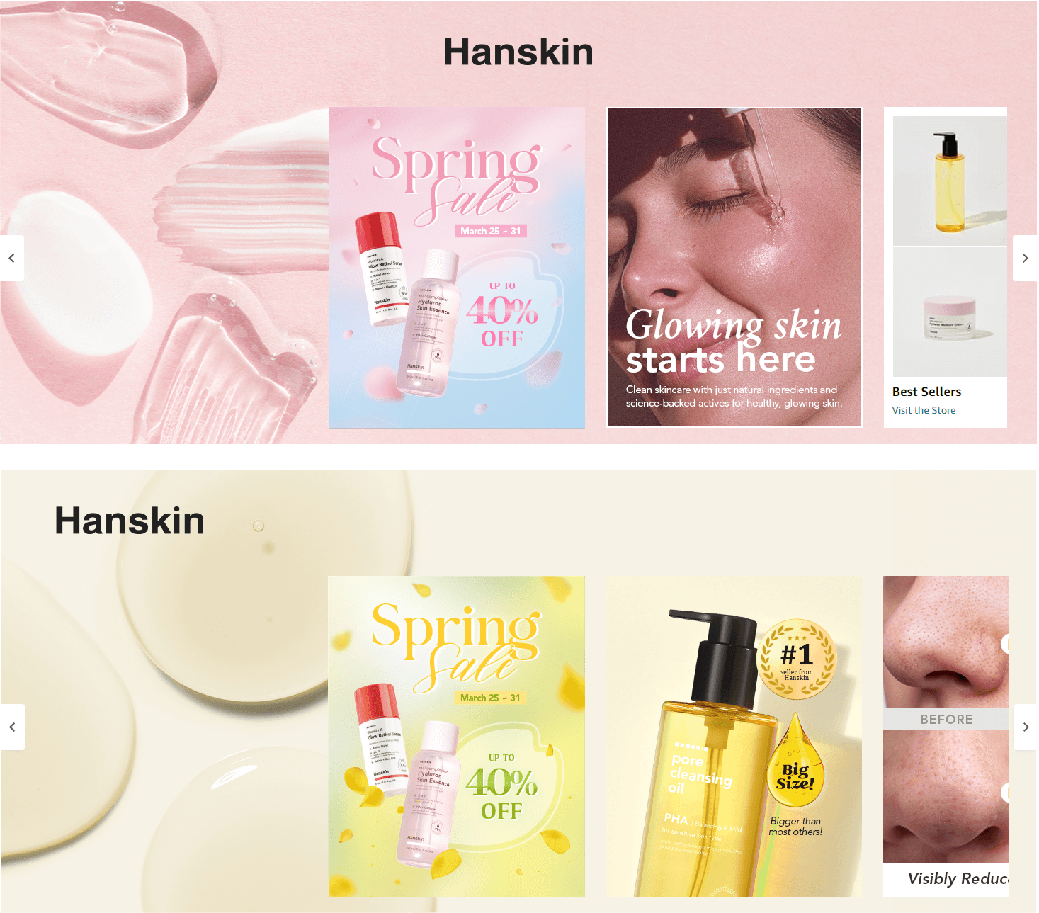 I led the visual redesign and ongoing content management for Hanskin's Amazon presence, revitalizing their existing best-selling product listings with clean, trend-aligned imagery that emphasizes the brand's signature glowy, dewy skin results. The project involved transforming outdated listing images and A+ content into modern, customer-appealing visuals that better communicate product benefits and the coveted K-beauty glow. Additionally, I created and managed regular updates to their brand story and storefront banner images, including timely seasonal campaigns for key sales events like Mother's Day, Spring Sales, Black Friday, and Amazon Prime Day, ensuring the brand maintained fresh, relevant messaging that drove customer engagement throughout the year.
