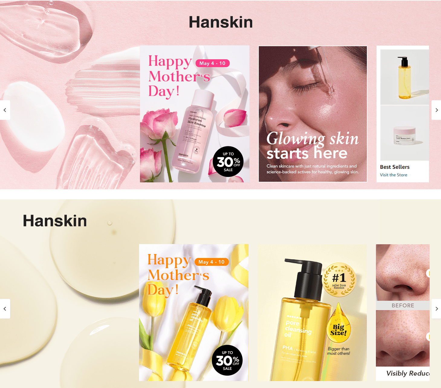 Hanskin needed regular content updates to maintain fresh brand presence and capitalize on seasonal sales opportunities throughout the year. | Established ongoing seasonal campaigns for major sales events (Mother's Day, Black Friday, Prime Day, etc.) with dynamic banners and brand story updates that drove engagement during peak shopping periods. |