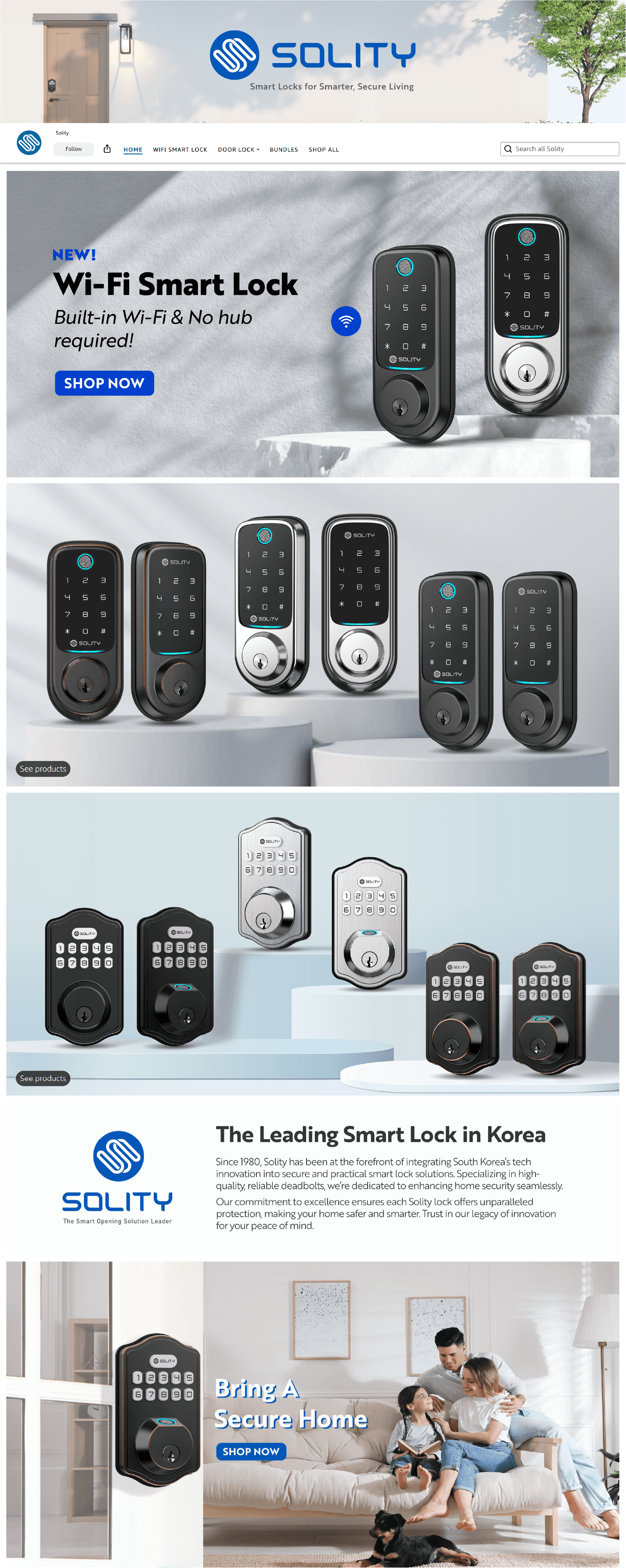 Solity needed a dedicated space on Amazon that went beyond individual listings, somewhere to communicate brand heritage and showcase their range of smart lock products as a unified lineup. | Designed a structured, visually consistent Brand Store, organizing the space to guide shoppers from brand discovery to product consideration with clear hierarchy and a modern, trustworthy aesthetic. |